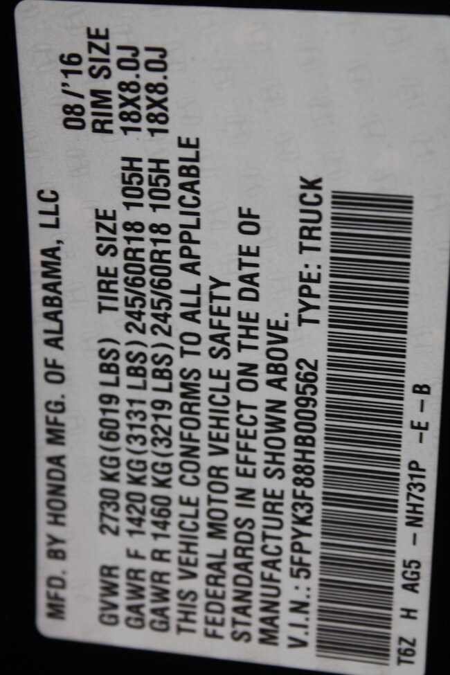 - VIN : 5FPYK3F88HB009562